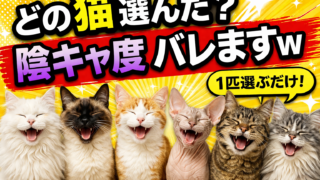 6匹の猫から直感で1匹選ぶだけで、あなたの「陰キャ度」が分かる心理テスト!見た目では分からない意外な結果に驚くかも?友達とも盛り上がる診断コンテンツです。