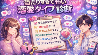 12の質問であなたの恋愛タイプが分かる診断。愛され型・沼らせ型・ツンデレなど6タイプを判定し、相性がいい人・悪い人まで深掘り解説。驚くほど当たると話題の恋愛診断。