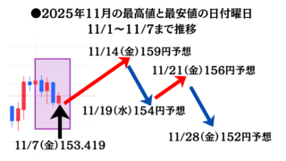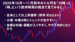 2025年10月〜11月前半のドル円を「9〜15時」「15〜21時」「21〜27時」の3つの時間帯に分けて徹底分析。曜日ごとの上昇・下落傾向、特徴、勝率をわかりやすくまとめました。デイトレや時間帯分析の精度を上げたいFXトレーダー必見。