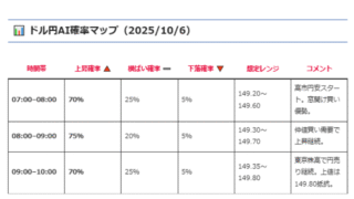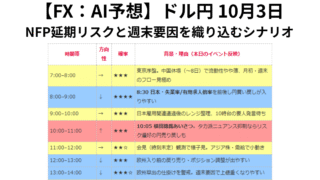 FX 【FX:AI予想】ドル円 10月3日|NFP延期リスクと週末要因を織り込むシナリオ 10月3日のドル円相場をAIが1時間単位で先読み。週末の特殊要因と米政府閉鎖による統計延期リスクを考慮したデイトレ戦略に。 2025.10.02 FX