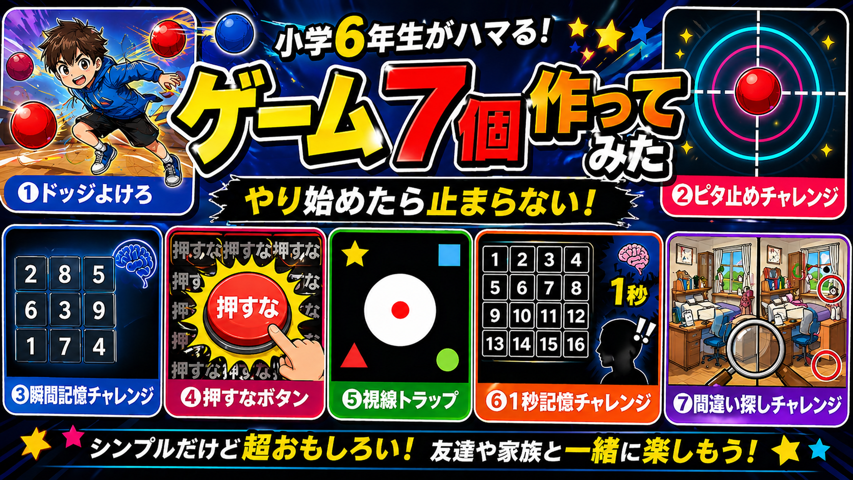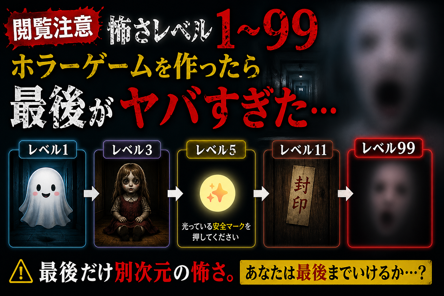 怖さレベル1から99まで段階的に強くなるホラーゲームを自作。かわいいおばけから始まり、最後は“絶対に押してはいけない瞬間”の恐怖へ。シンプル操作なのにガチでビビる体験ができる。