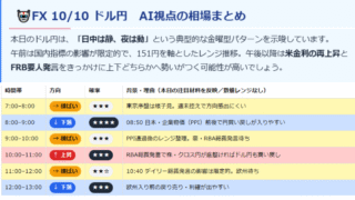 FX ドル円 10/10(金)AIシナリオ|週末要因+米金利&要人発言でボラ拡大に備える 10/10(金)のドル円は、日本PPI・RBA総裁発言・米ミシガン指数・FRB要人発言が焦点。AIが7:00〜26:00の1時間ごとの方向性を色分けで予測。上昇=赤、下落=青、横ばい=黄で直観的に把握できます。 2025.10.10 FX