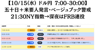 FX 【10/15(水) ドル円 7:00–30:00】五十日+米要人発言・ベージュブック警戒/21:30NY指数→深夜はFRB連投 10/15のドル円は五十日で仲値需要に注意。21:30NY連銀指数、22:30&25:30ミラン、26:00ウォラー、27:00ベージュブック、28:45RBA総裁で深夜に変動拡大リスク。 2025.10.15 FX