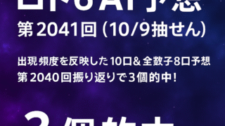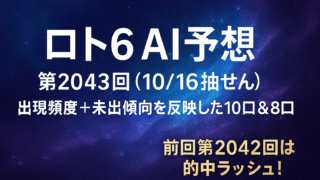 ロト6 ロト6 AI予想|第2041回(10/9抽せん)最新10口&全数字8口予想|第2040回振り返りで3個的中! 「ロト6第2041回(10/9抽せん)をAIが徹底予測!過去の出現頻度を反映した10口予想と、1〜43の全数字を使った8口予想を公開。前回(第2040回)は3個的中を記録!AIが導く次のチャンスをお見逃しなく。」 2025.10.07 ロト6