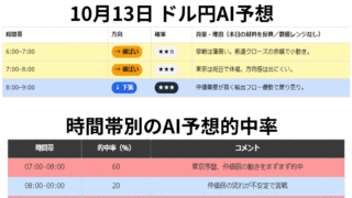 FX 10月13日 ドル円AI予想|休場相場でも狙えるAIシナリオと要人発言の注意点 日本・カナダ休場で薄商い。中国貿易収支と英MPC発言、米要人発言がカギ。AIが6:00〜30:00の方向と確率を時間別に解説。 2025.10.13 FX