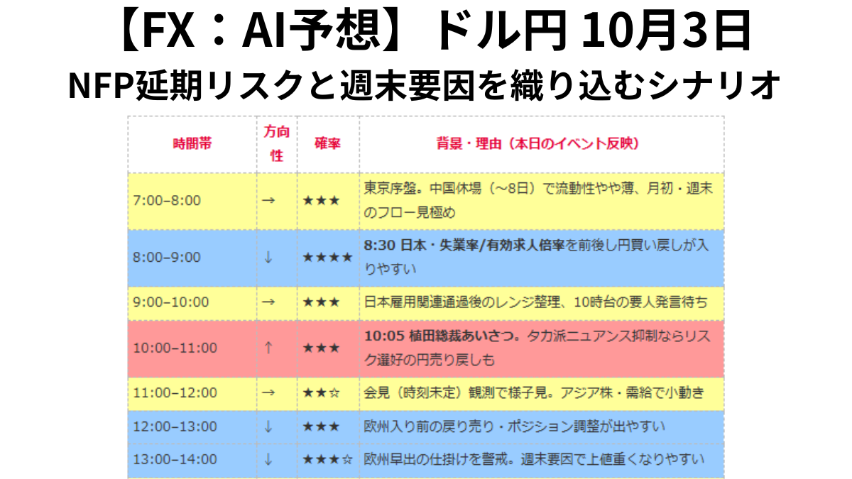 本日10月3日のドル円相場は、日本の雇用統計や植田総裁発言、欧州PMI改定、そして米ISM非製造業景況指数など重要イベントが集中します。米政府閉鎖によりNFP発表が延期される可能性もあり、相場は例年以上に神経質な展開となりそうです。AIが1時間ごとのシナリオを整理しました。