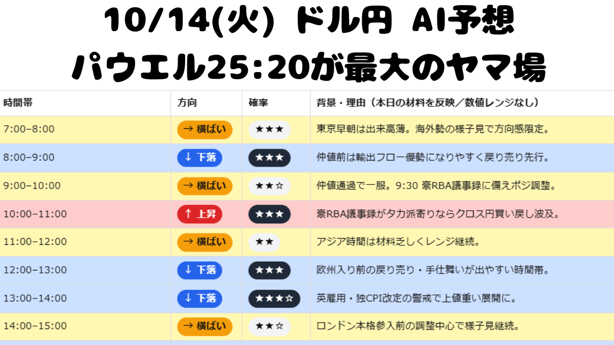 時間帯 | 方向 | 確率 | 背景・理由(本日の材料を反映/数値レンジなし) |