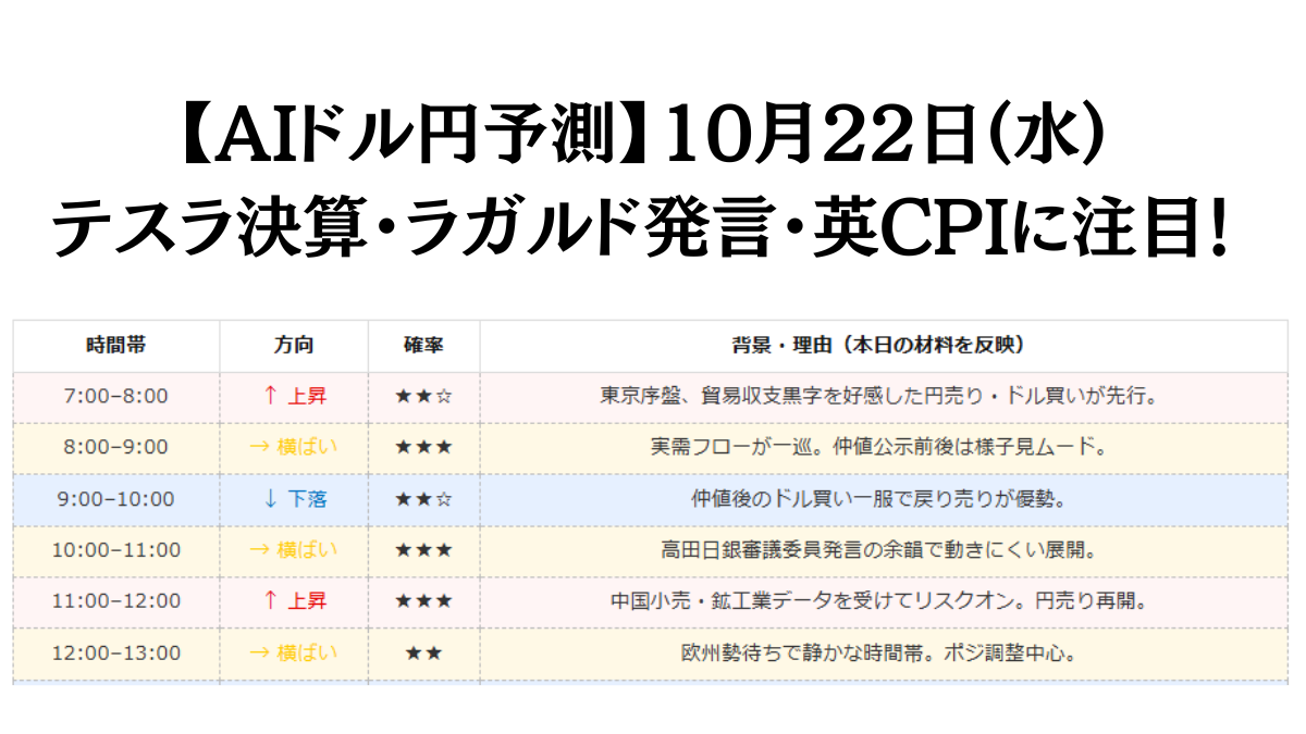 19:00–20:00 | → 横ばい | ★★★ | 欧米要人発言を前に様子見。方向感限定。 |