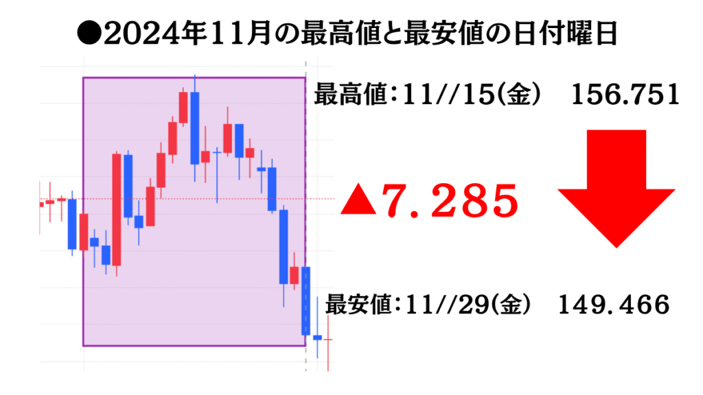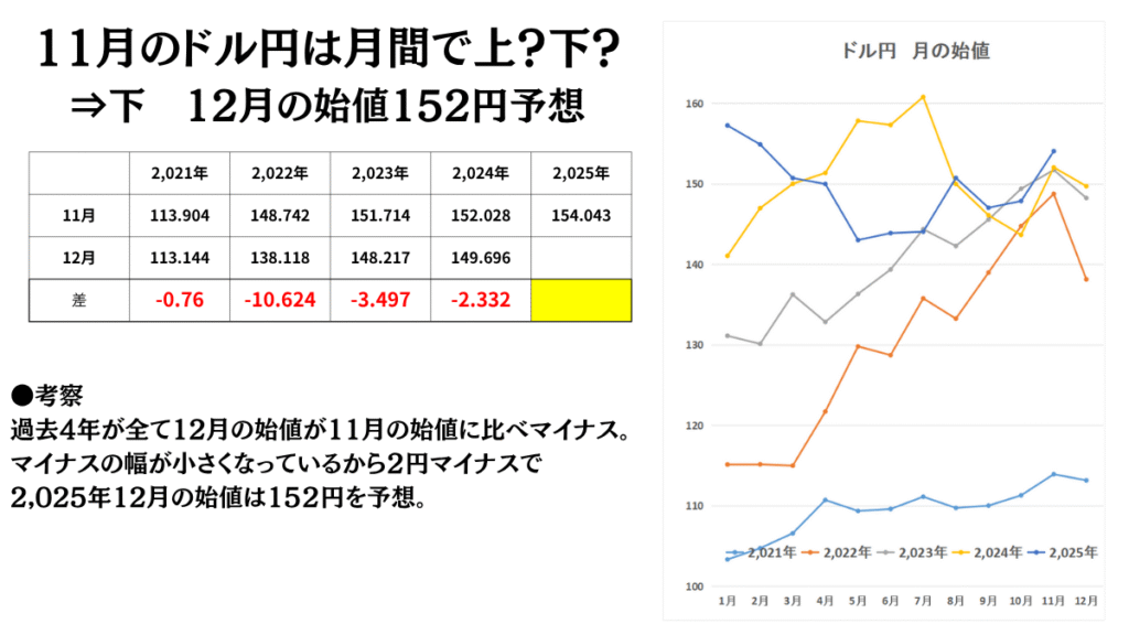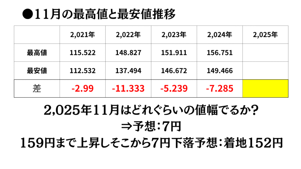 FX【ドル円11月予想】過去4年の月足は陰線、2,025年11月は? FX 2025.11.08 11月8日に予想 11月最高値予想:11/14(金)159円 11月最安値予想:11/28(金)152円 さあ、例年通りか、違う動きか乞うご期待!