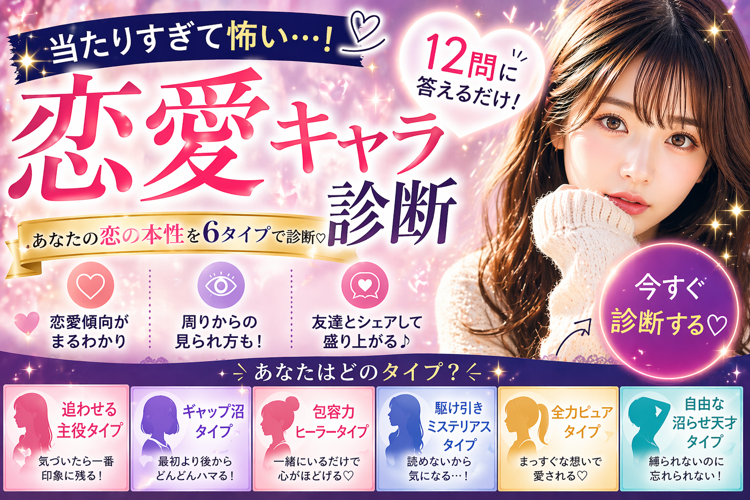 12問に答えるだけで、あなたの恋の本性を6タイプで診断。