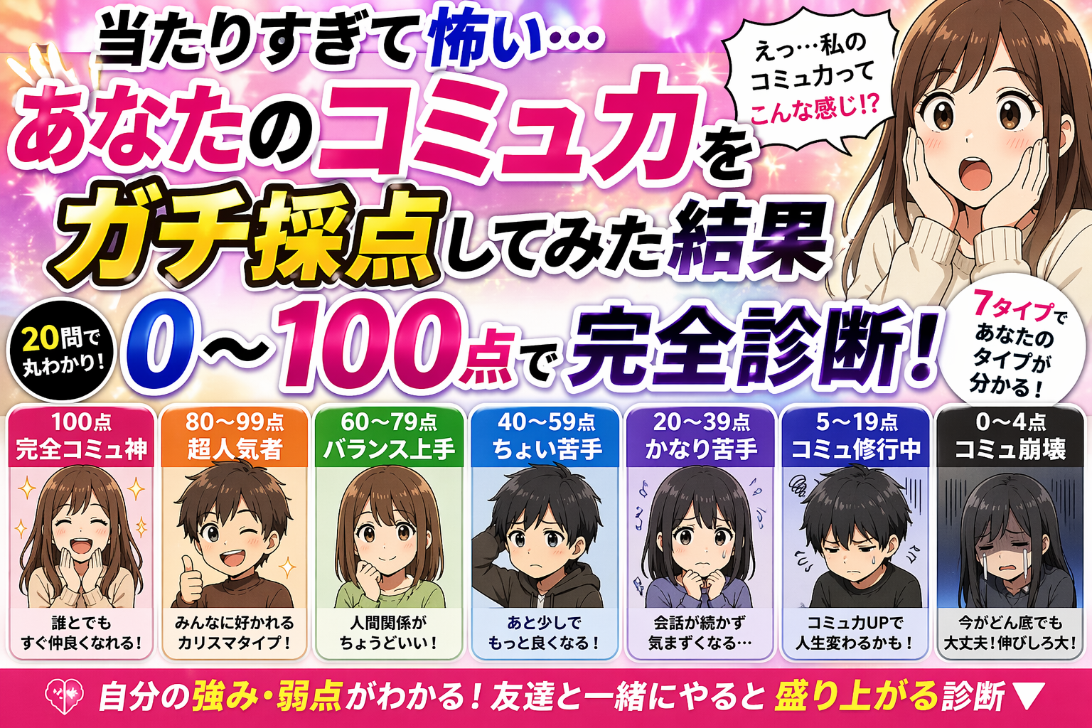 0点〜100点でリアルなコミュ力が分かる診断。